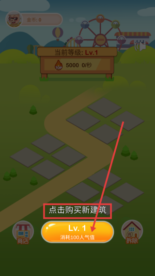 1、游戏初始等级为Lv.1,可点击“点击购买新建筑”按钮,消耗人气值(如100人气值)购买建筑,放置在场景空地,开启建筑布局。