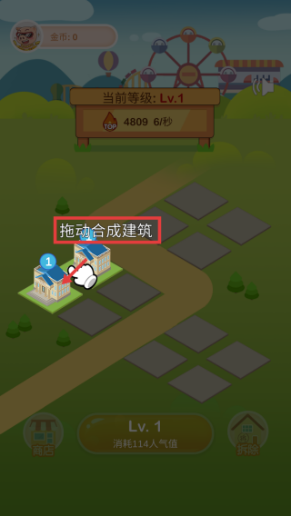 2、当拥有多个同等级建筑时,按照“拖动合成建筑”提示,将相同等级建筑拖动合并,可升级为更高级建筑,提升建筑收益和游戏等级。