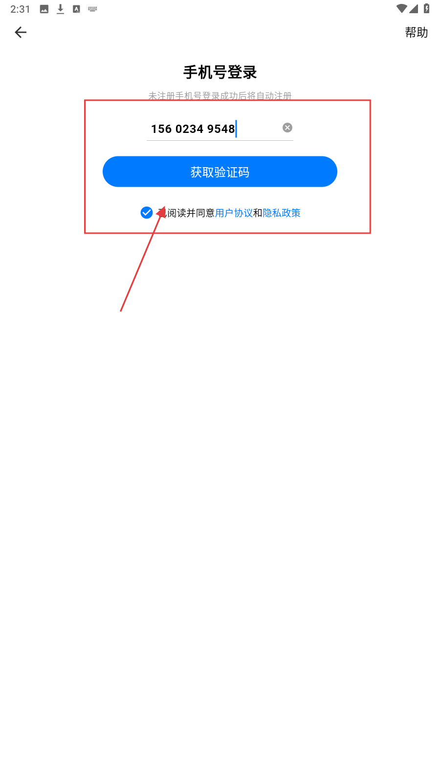 2、进入【手机号登录】页面,输入手机号,勾选协议后点击【获取验证码】。