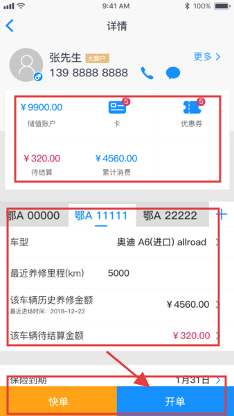 1、在【详情】页,查看客户账户信息(储值、待结算等)、车辆(鄂A车牌等)及历史消费,点击【开单】进入下一步。