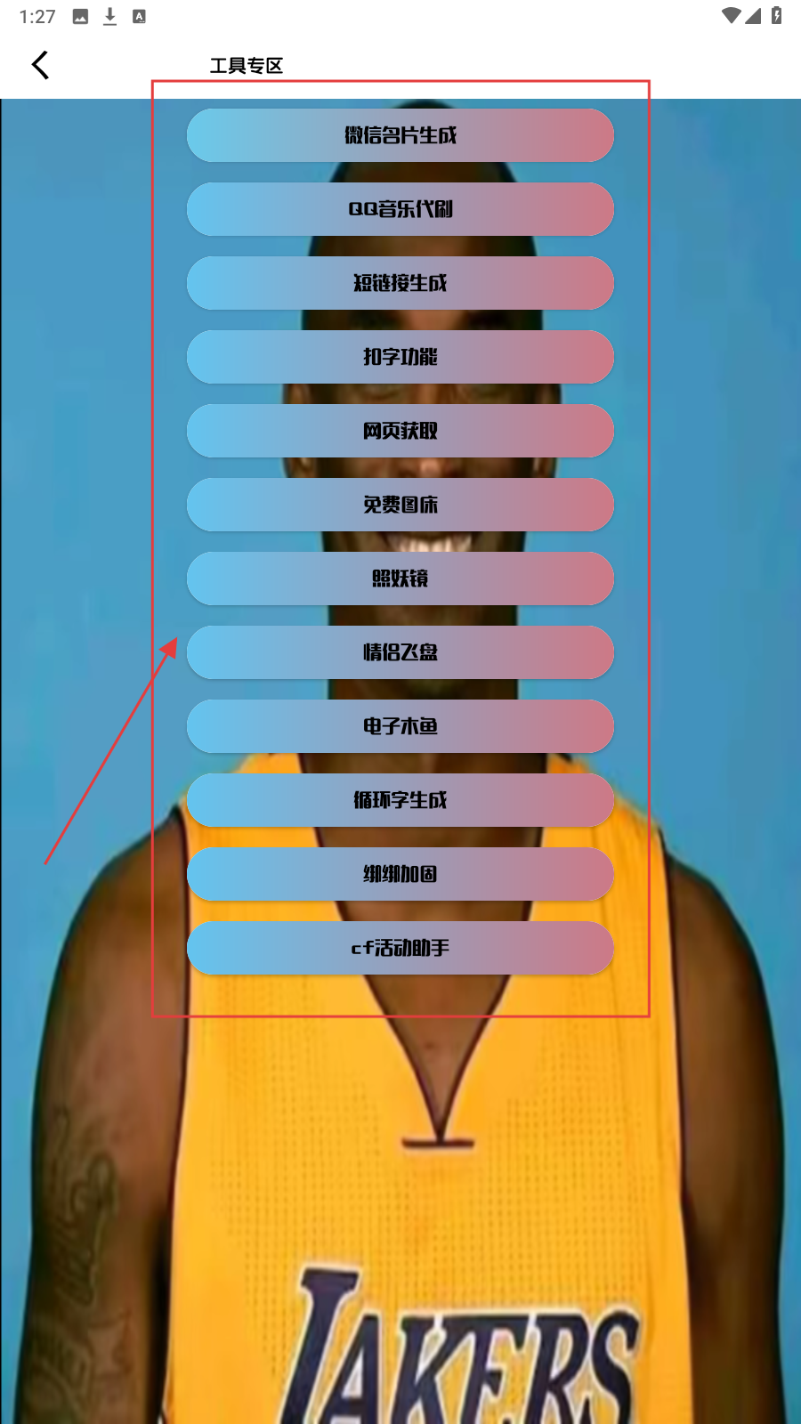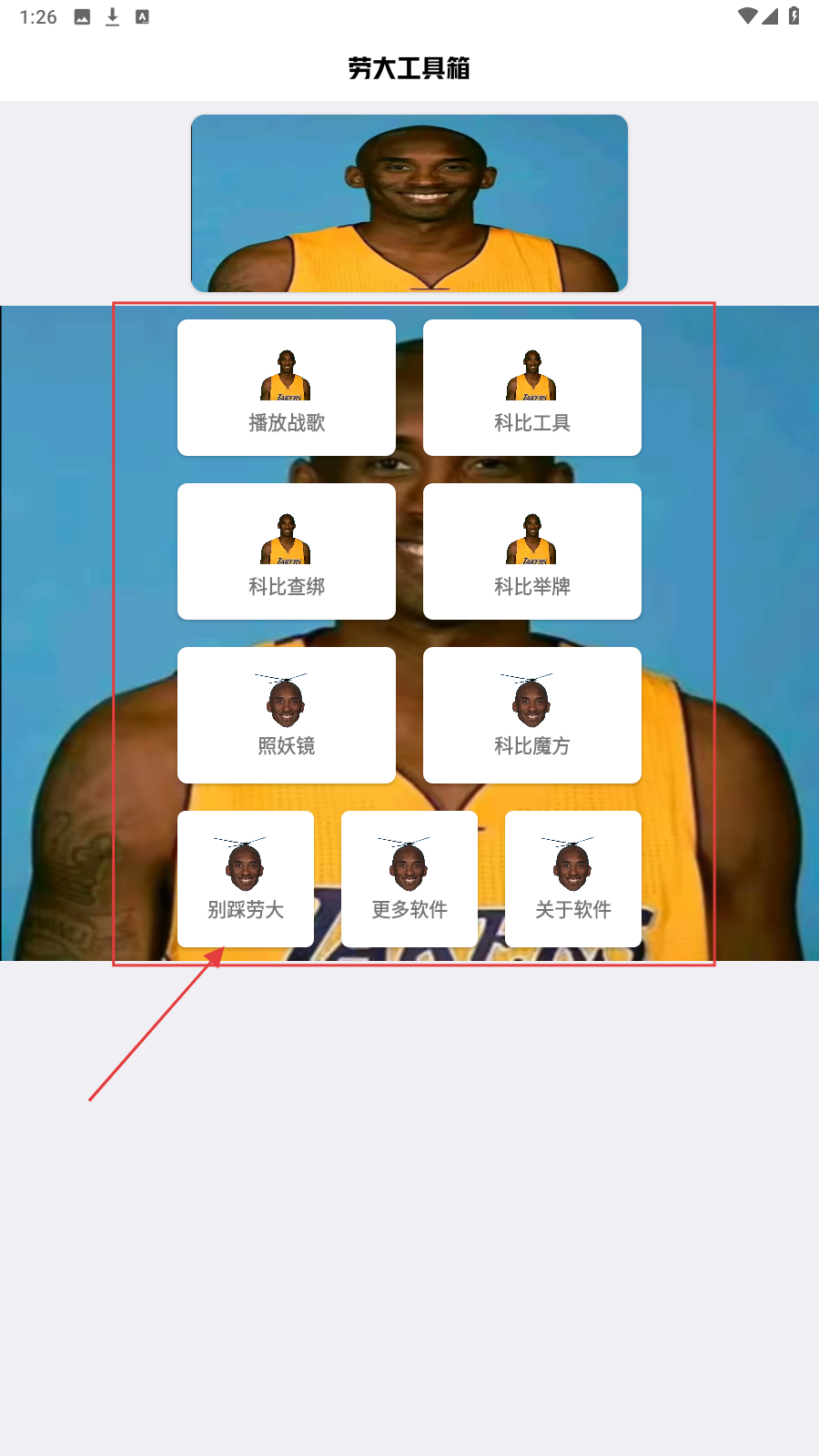 1、打开“牢大工具箱”,首页呈现【播放战歌】【科比工具】【科比查绑】等功能,点击对应按钮可使用相关工具。