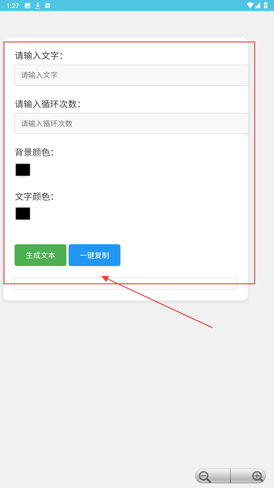 3、以循环字生成为例,在功能页输入文字、循环次数,选背景与文字颜色,点【生成文本】【一键复制】完成操作。