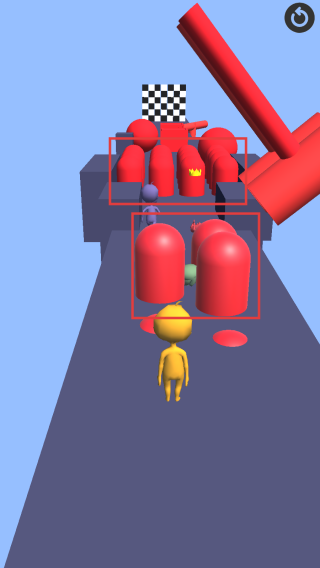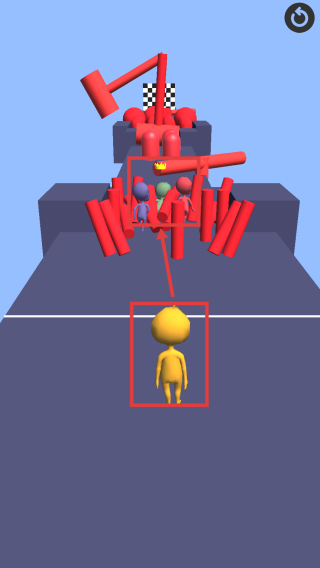 1、游戏开始,操控黄色小人前进,观察前方红色障碍物的布局和运动规律,寻找安全通道通过。注意场景中戴着皇冠的小人,需要超过他。