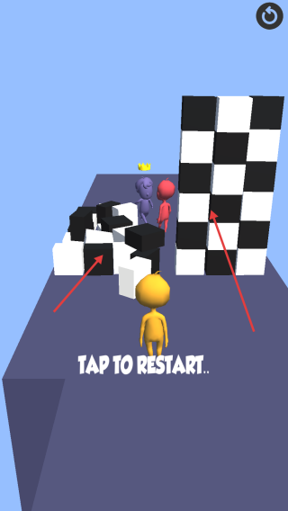 3、当遇到黑白方块组成的障碍物时,规划好路线,确保小人能够顺利通过。若游戏失败出现“TAPTORESTART...”提示,点击屏幕重新开始。
