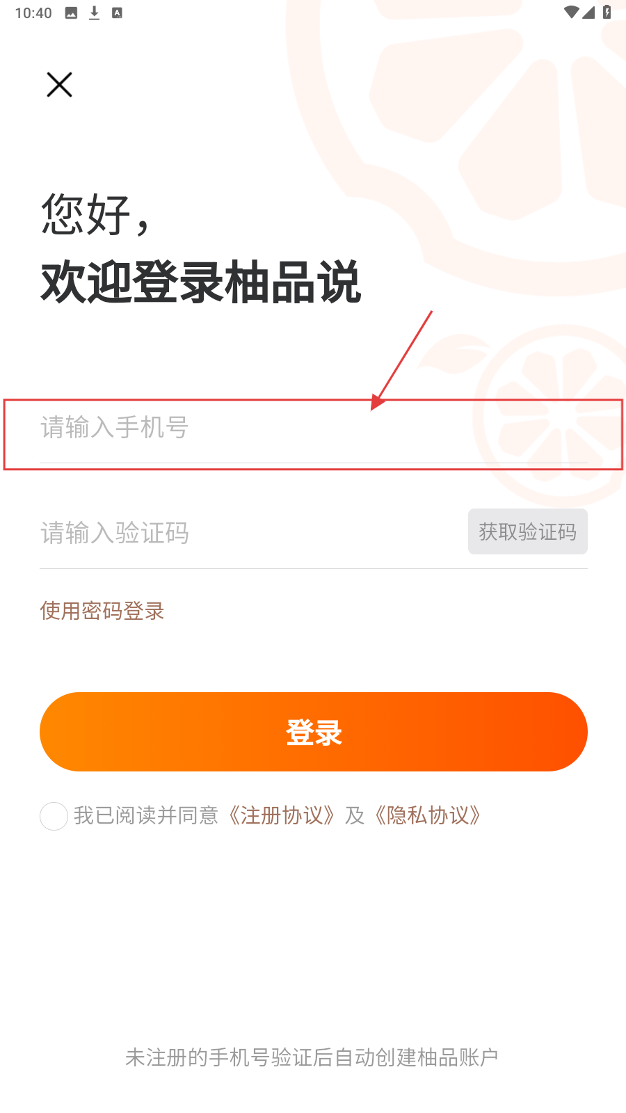 1、在“柚品说”登录页,于【请输入手机号】框填手机号。