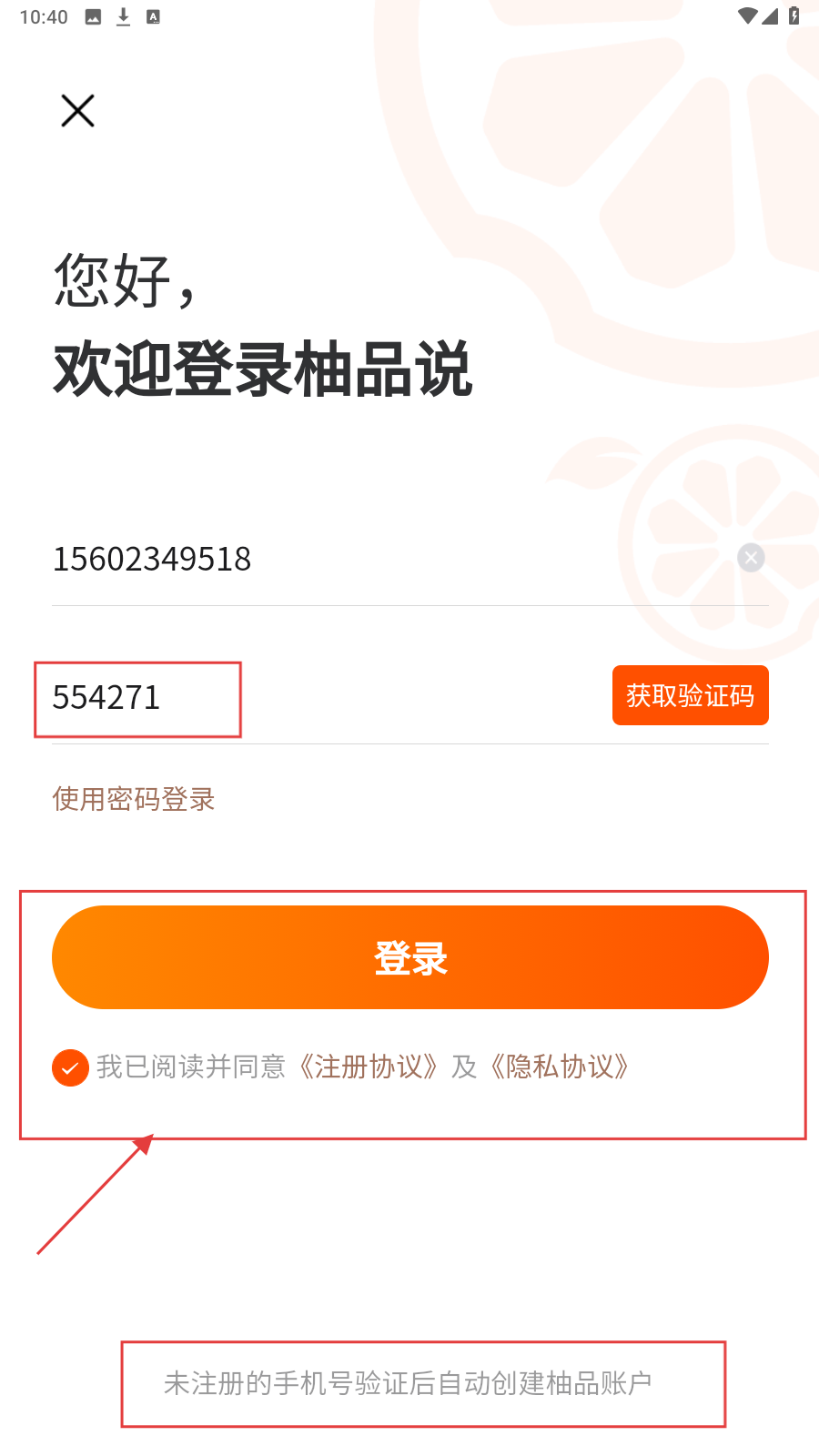 3、勾选【我已阅读并同意《注册协议》及《隐私协议》】,点橙色【登录】按钮完成登录,未注册手机号验证后自动创建账户。
