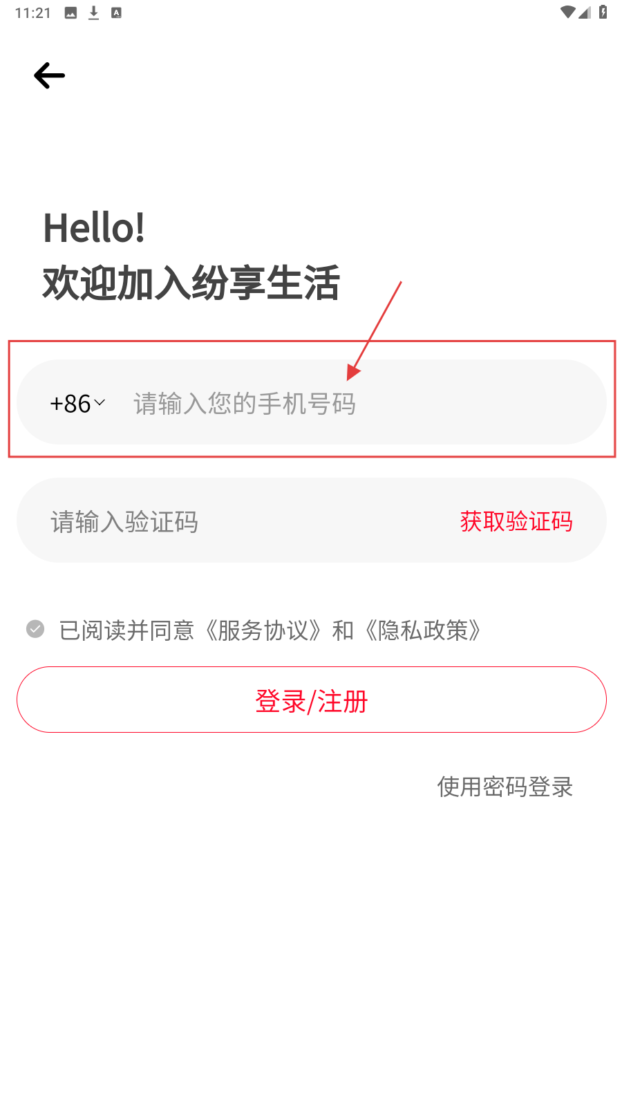 1、打开“纷享生活”登录页,在【请输入您的手机号码】填手机号。