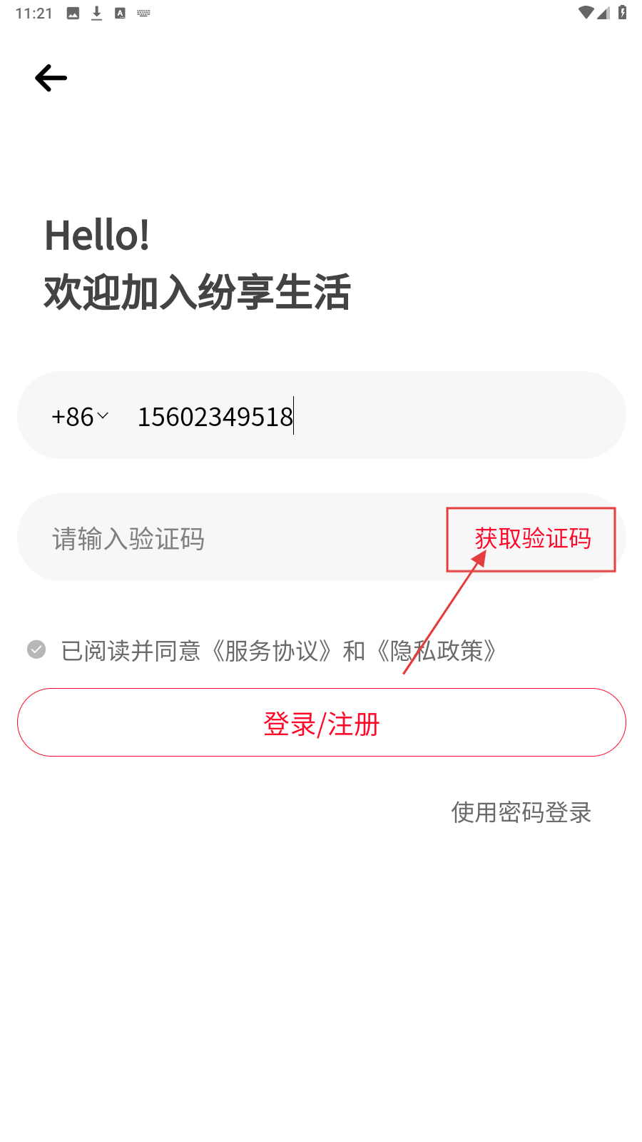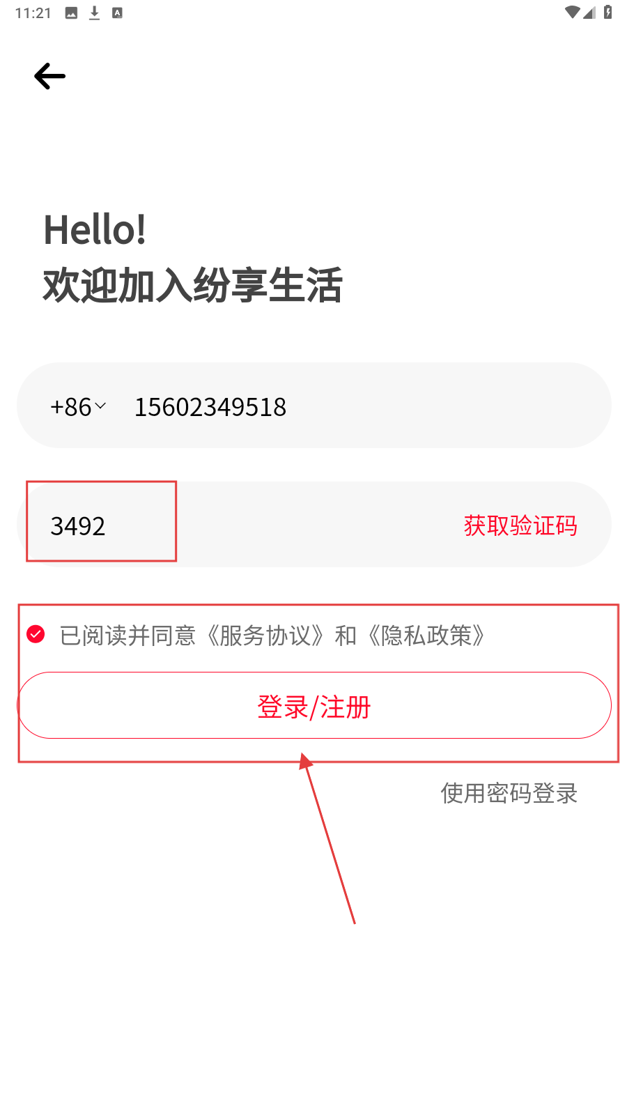 3、勾选【已阅读并同意《服务协议》和《隐私政策》】,点【登录/注册】完成操作。
