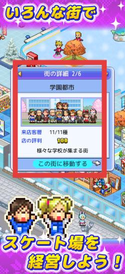 1、在(在各种各样的城镇)界面,关注“街の詳細”(城镇详情),如“学園都市”的来店客層、店の評判等信息,根据情况选择城镇移动经营。