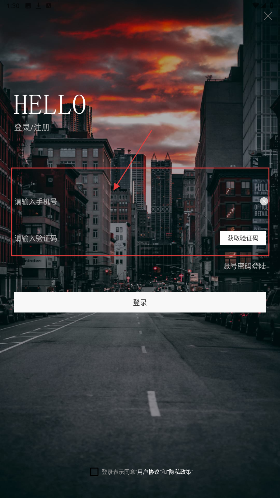 1、打开APP,进入登录/注册界面,若选择【验证码登录】,在【请输入手机号】处填写手机号码,然后点击【获取验证码】。