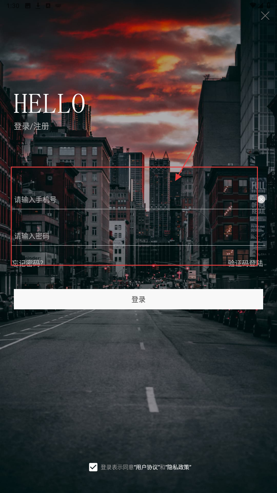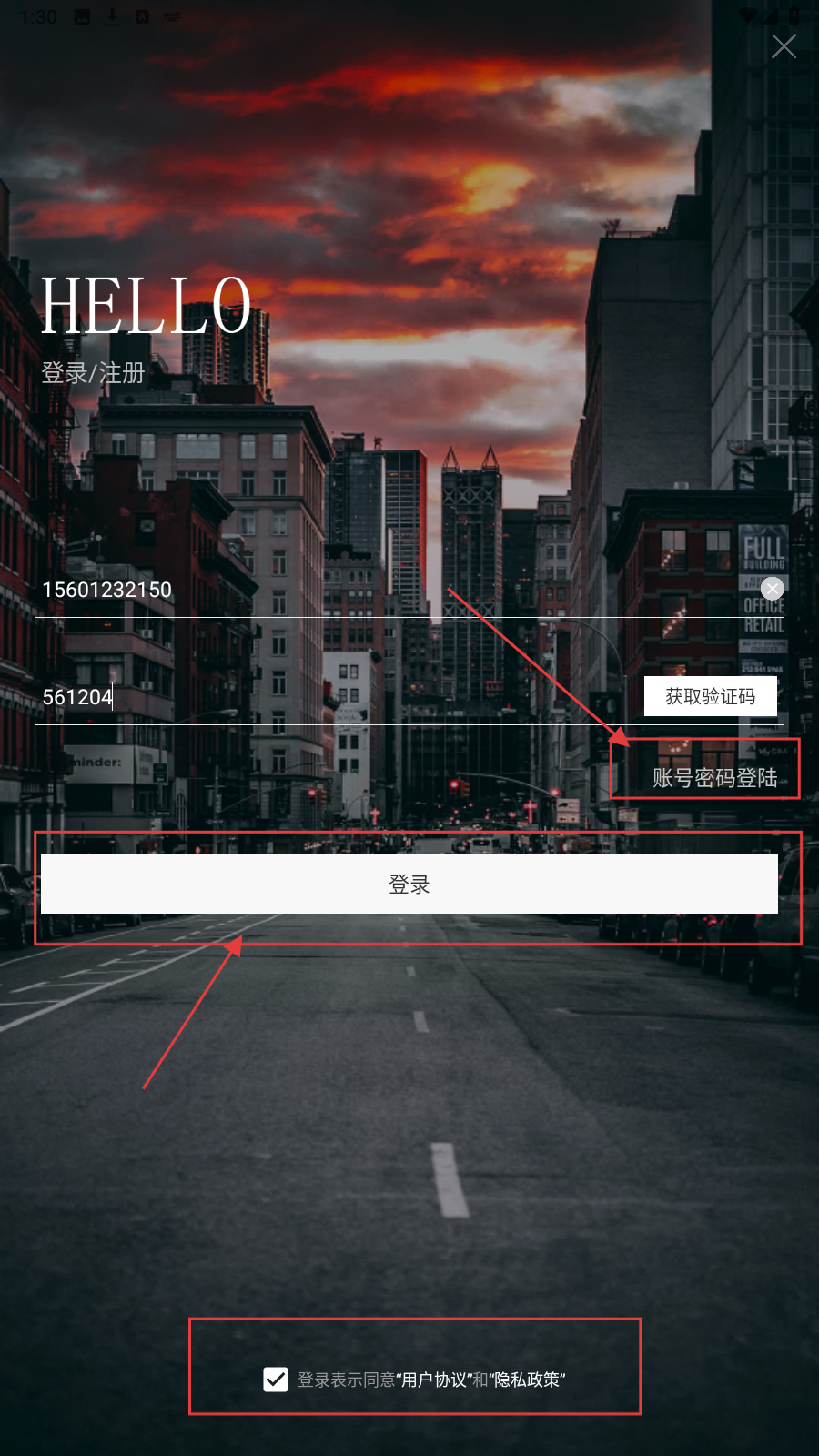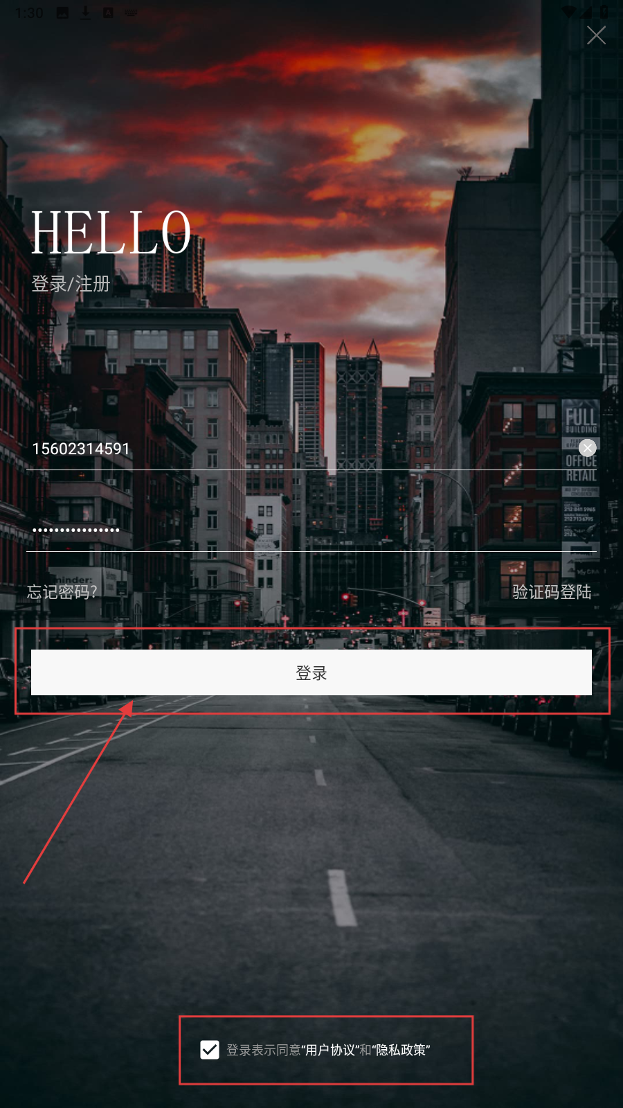 2、收到验证码后,填到【请输入验证码】框,勾选【登录表示同意“用户协议”和“隐私政策”】,点【登录】按钮即可。