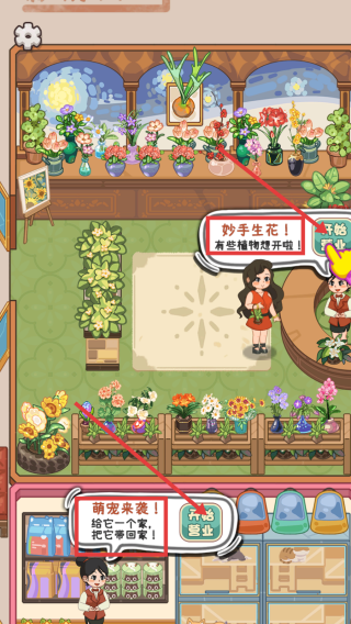 1、游戏初期,需时刻留意系统提示,及时点击对应花卉进行浇水、修剪等打理操作,以促进花卉快速生长与绽放,获取更多游戏内奖励。