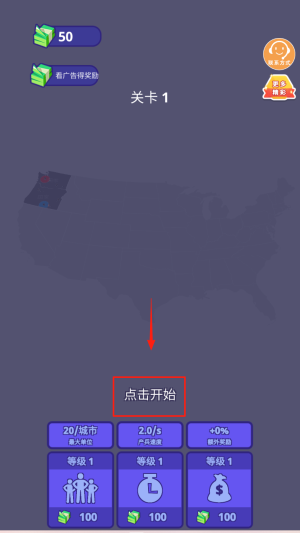 2、开始游戏:在关卡界面,点击“点击开始”按钮来启动游戏。
