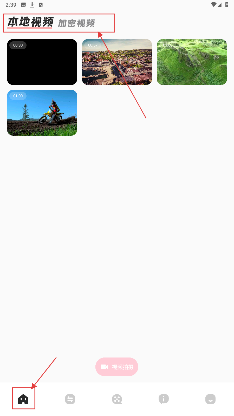 1、打开APP,点击【房子】图标进入首页。首页有【本地视频】和【加密视频】两个标签,同时还有【视频拍摄】按钮可供使用。
