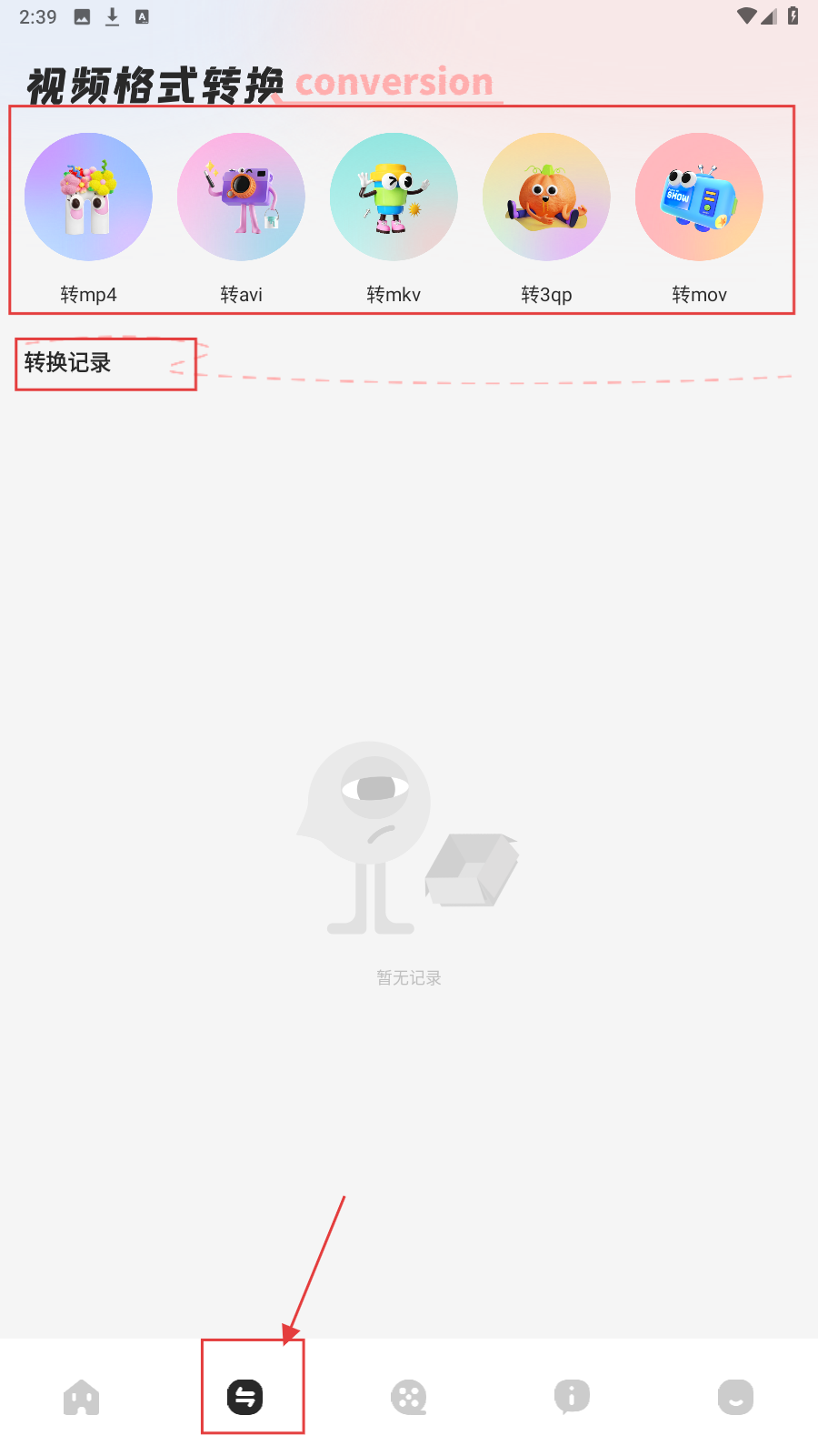 2、点底部【转换】图标,进【视频格式转换】页,有转mp4等格式选项,及【转换记录】区。