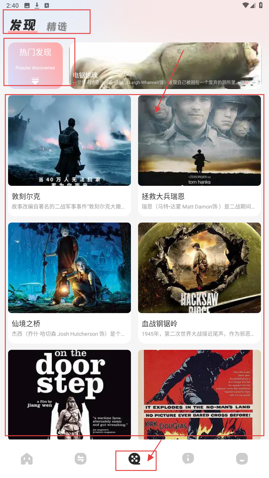 3、点底部【影片】图标,进带【发现】【精选】标签的页,【热门发现】区有《敦刻尔克》等影片推荐。