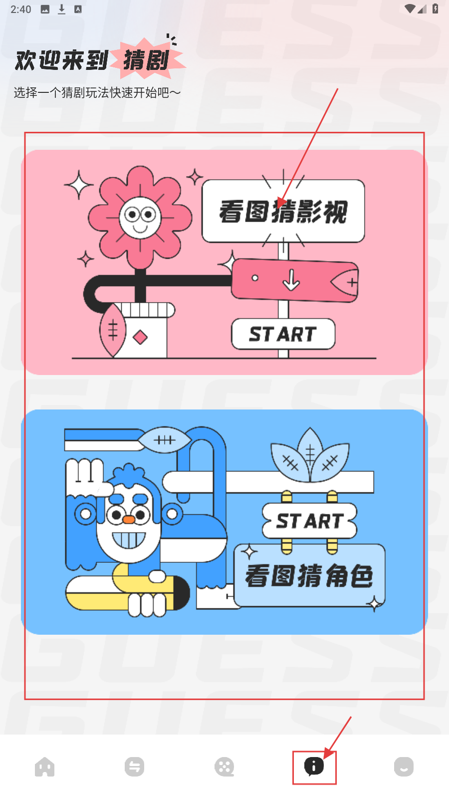 4、点底部【信息】图标,进【猜剧】页,含【看图猜影视】【看图猜角色】玩法,点【START】开始游戏。