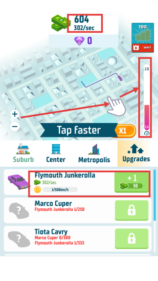 2、通过快速点击屏幕提升收益,参考右侧进度条,把握节奏,加速资金积累,解锁更多车辆。