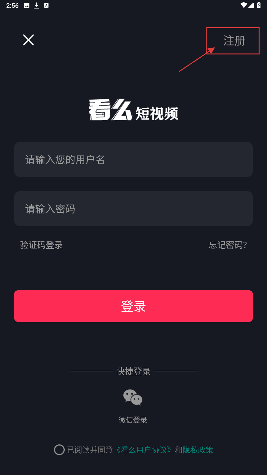 1、打开“看么短视频”APP,在登录页点击右上角【注册】,进入注册界面。