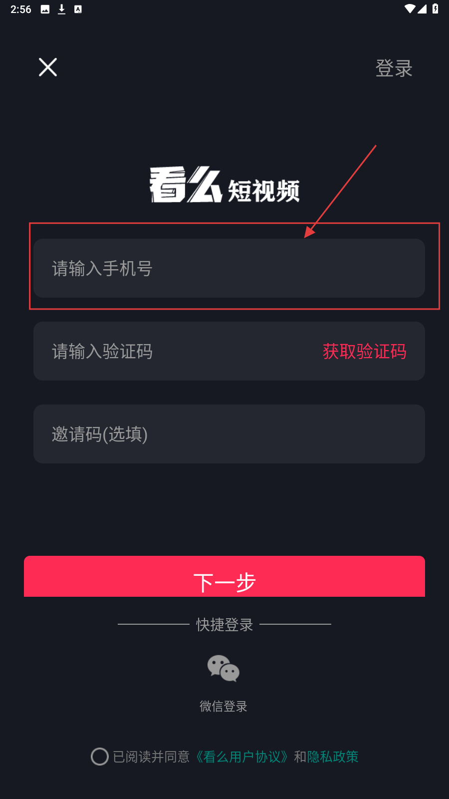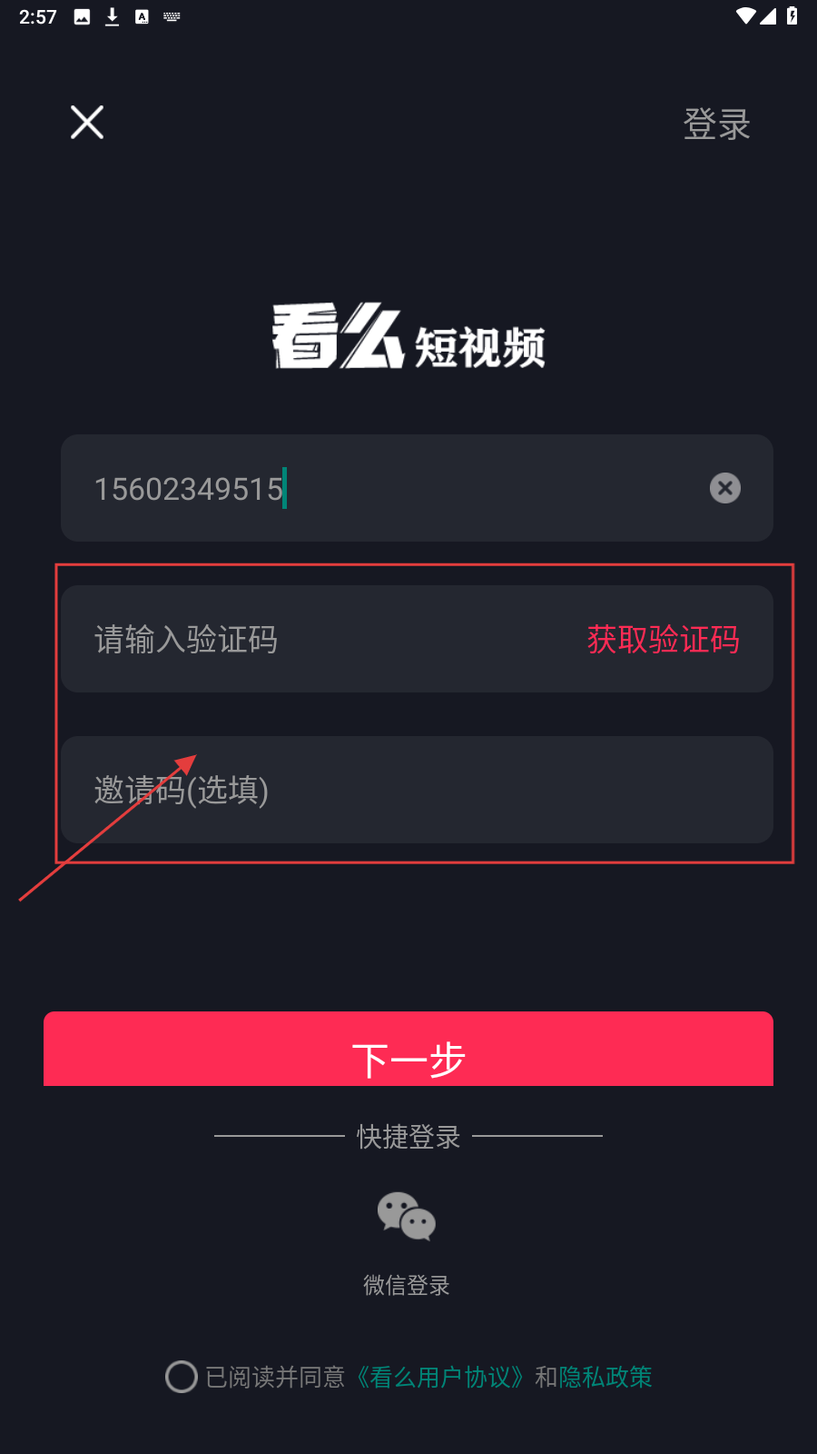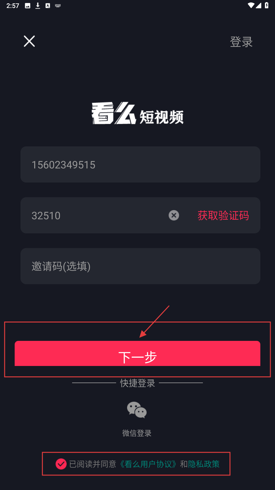 4、勾选【已阅读并同意《看么用户协议》和隐私政策】,确认手机号码、验证码等信息无误后点击【下一步】,完成注册流程。