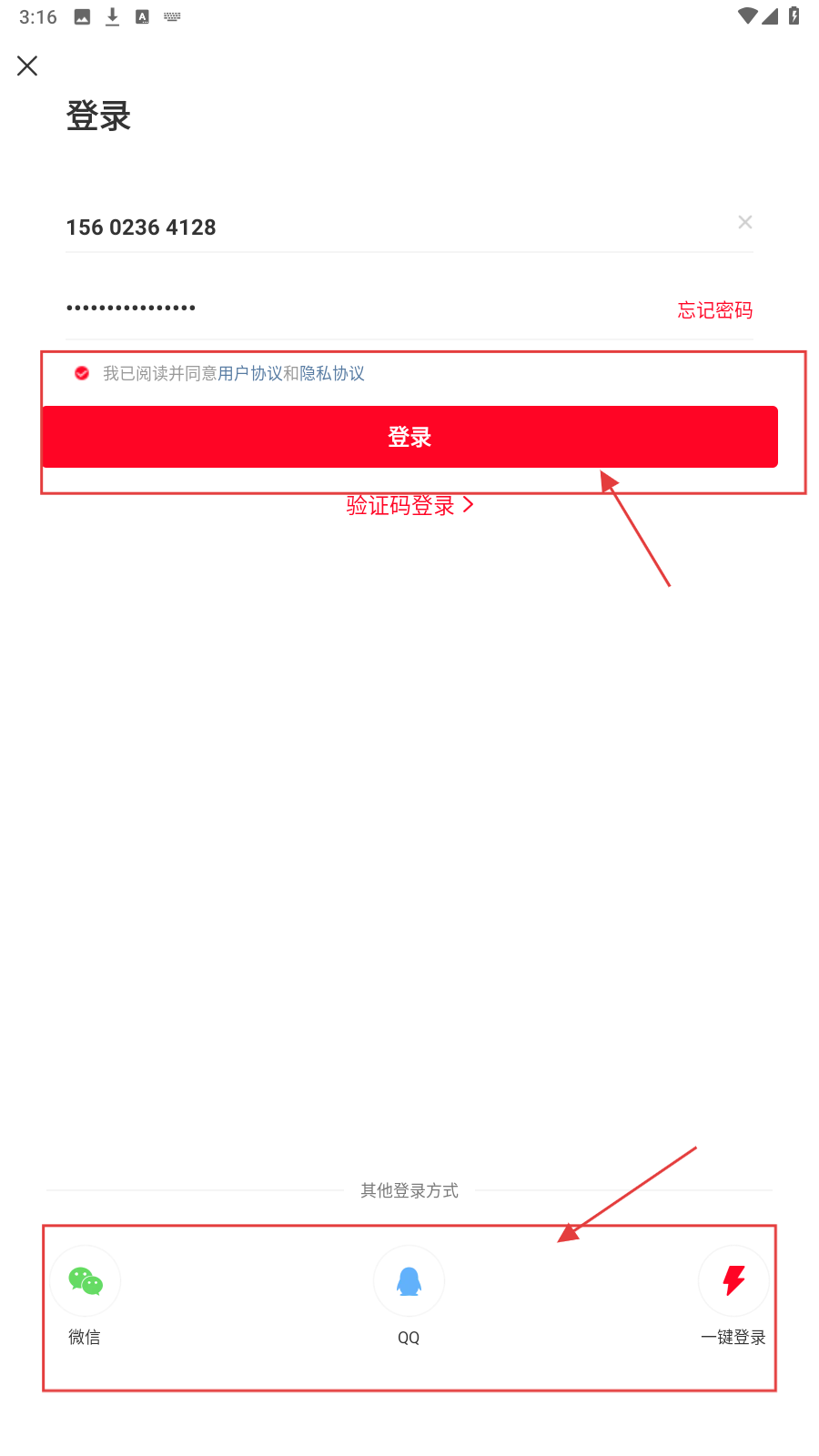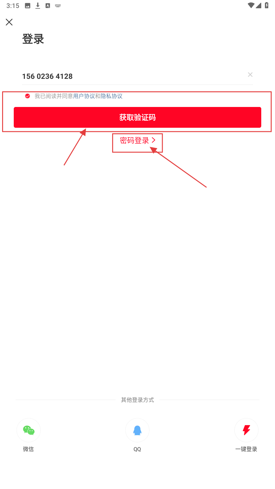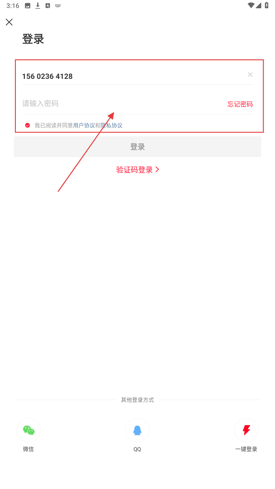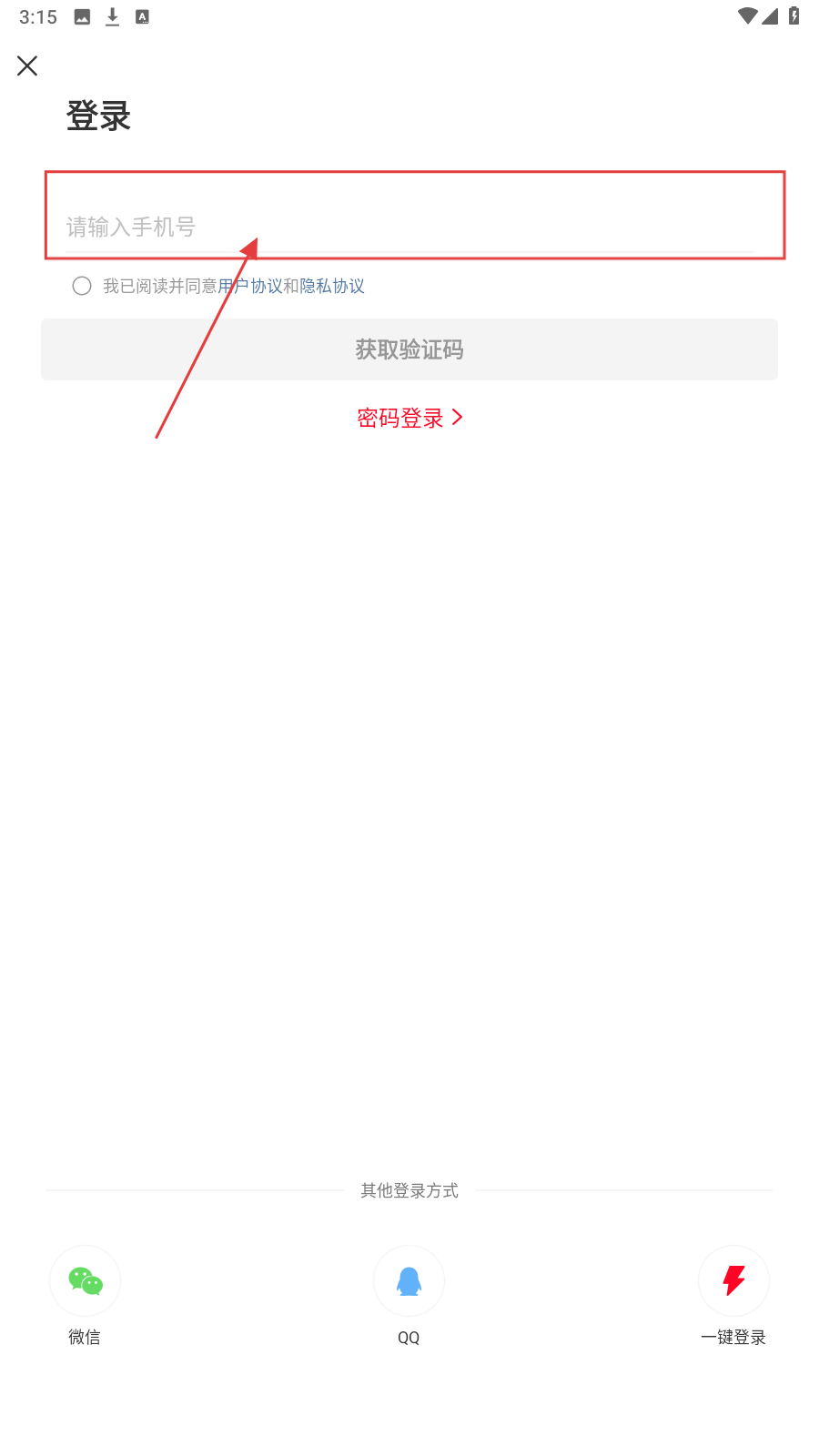 1、打开APP登录页,在【请输入手机号】栏填号码,勾选【我已阅读并同意用户协议和隐私协议】。
