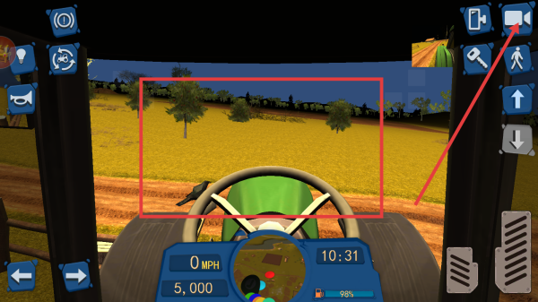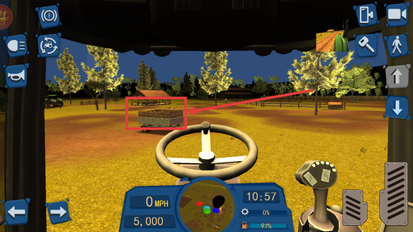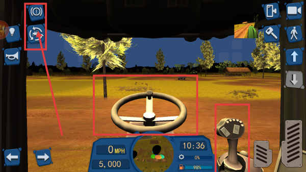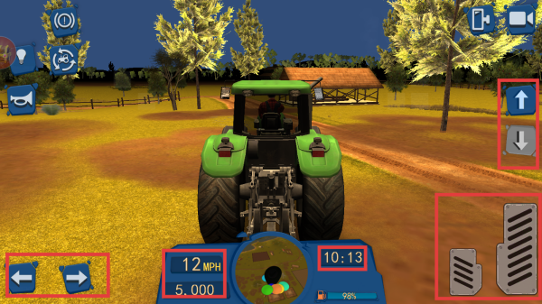 1、操控拖拉机时,使用屏幕边缘的蓝色方向键控制前进、后退和转向,留意速度表维持合适车速。