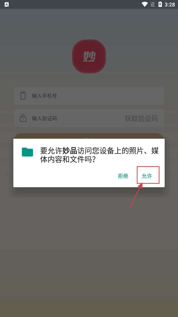 1、打开“妙品”APP,弹出权限申请框,点击【允许】,授权访问设备照片、媒体内容和文件。