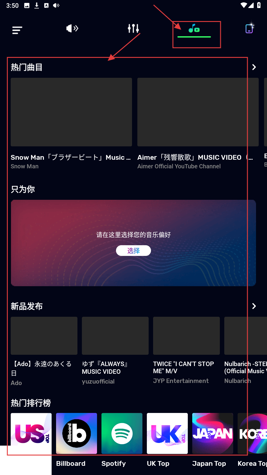 2、进入音乐图标页面,进曲目推荐页,有【热门曲目】、【音乐偏好选择】、【新品发布】、【热门排行榜】。