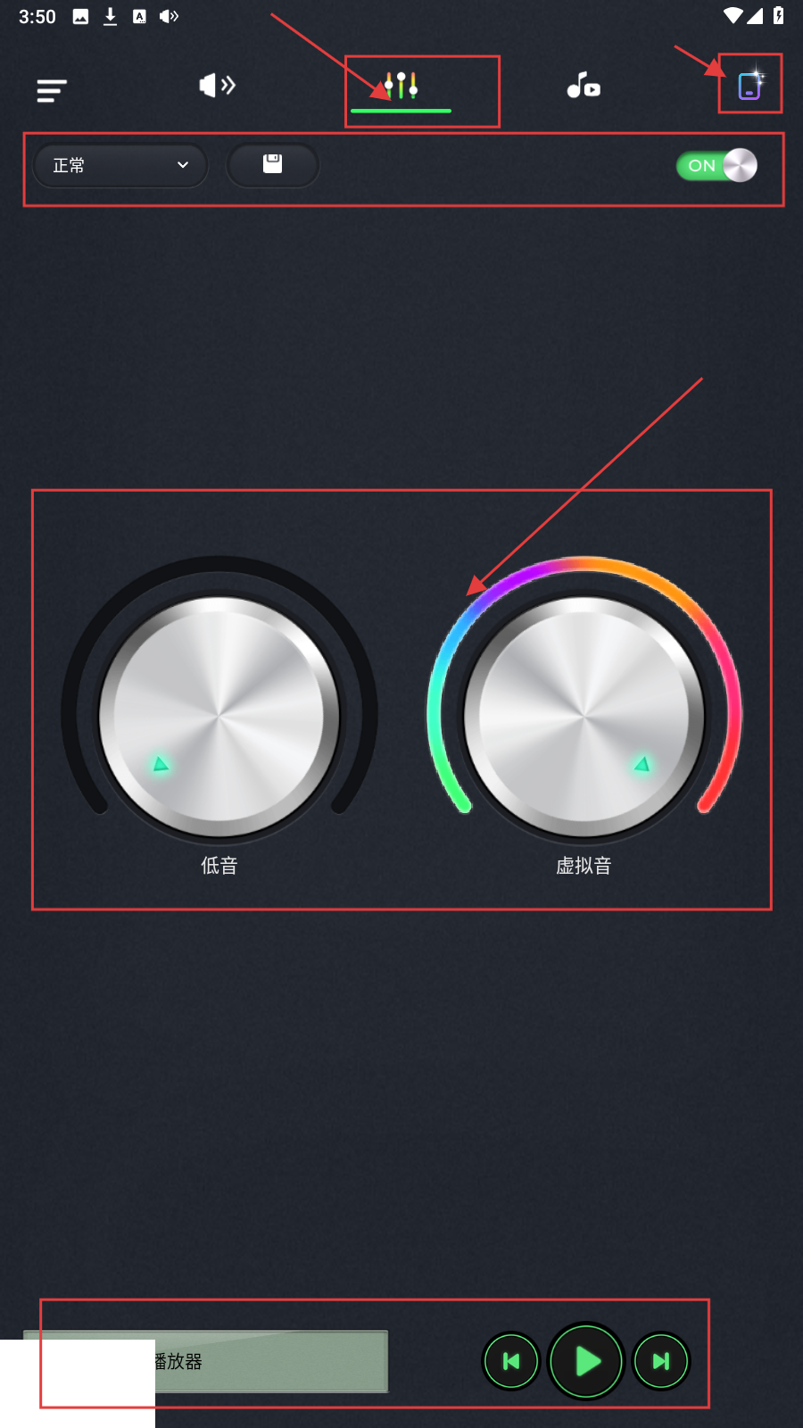 3、点击中间图标进入音效设置页,可调整【低音】、【虚拟音】旋钮,切换模式,控制功能开关(ON/OFF)。点击右上方手机图标。