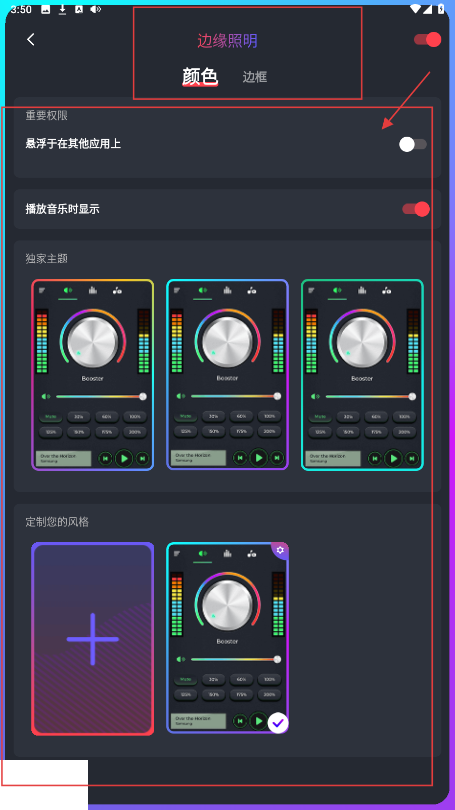 4、进入【边缘照明】设置页,开关【悬浮于其他应用上】权限,选【播放音乐时显示】,有【独家主题】【定制风格】等设置。