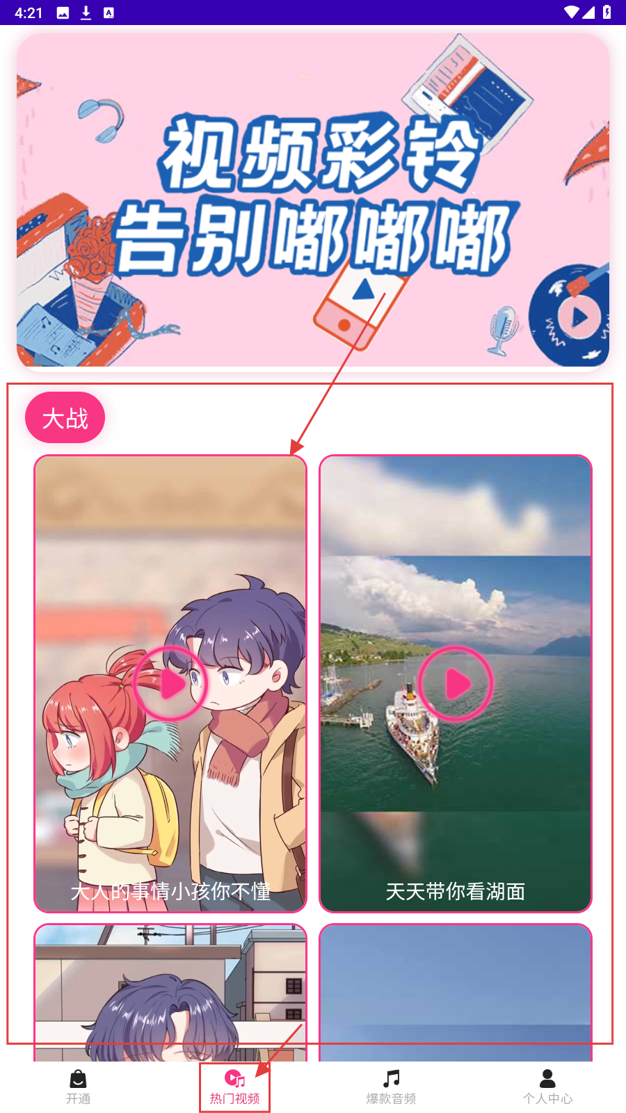 1、打开APP,进入【热门视频】页面,这里有“大人的事情小孩你不懂”“天天带你看湖面”等视频彩铃,点击播放按钮可播放。