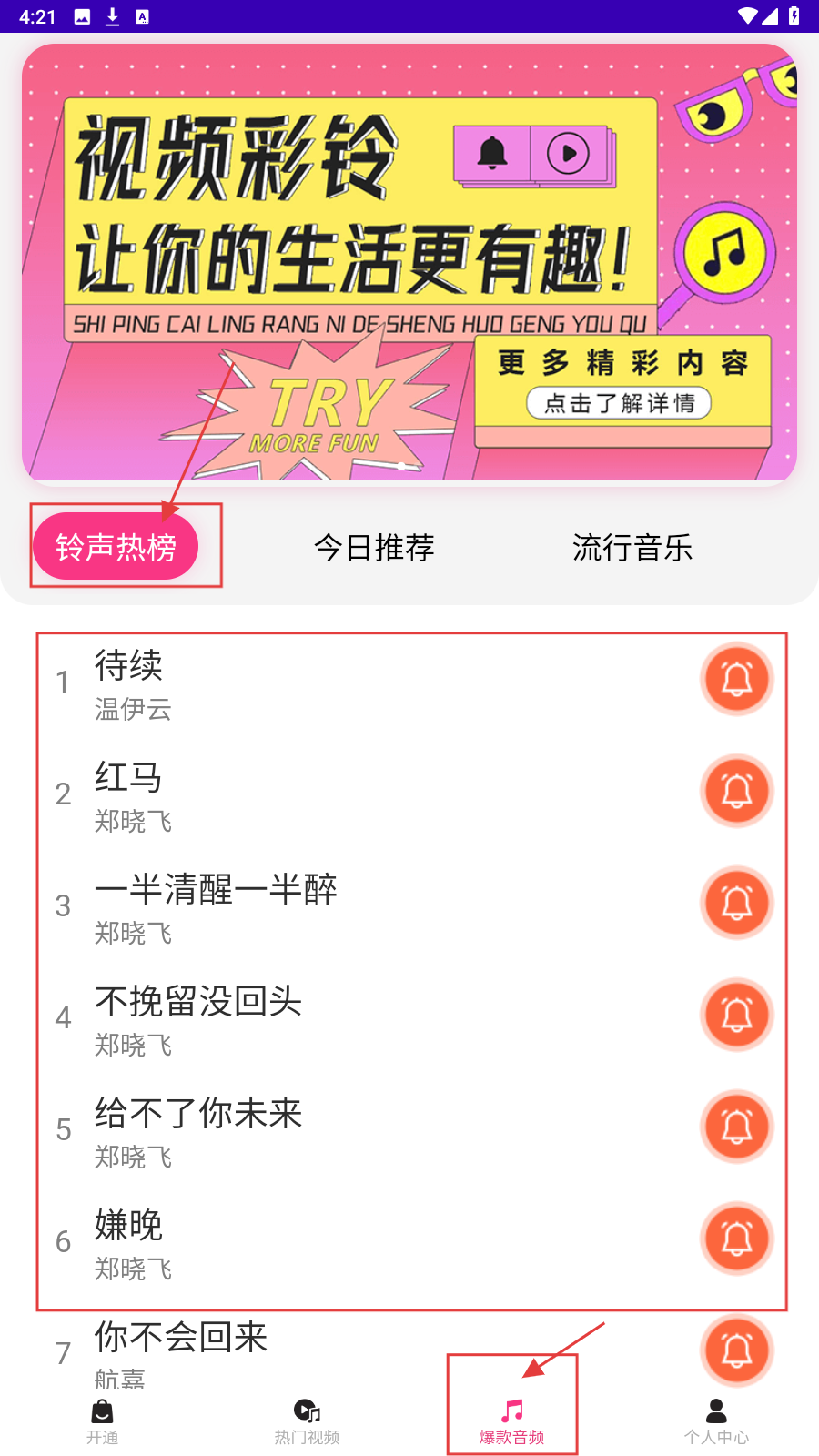 2、点击底部【爆款音频】,进入音频推荐页面,这里有【铃声热榜】,如温伊云的《待续》、郑晓飞的《红马》等歌曲。
