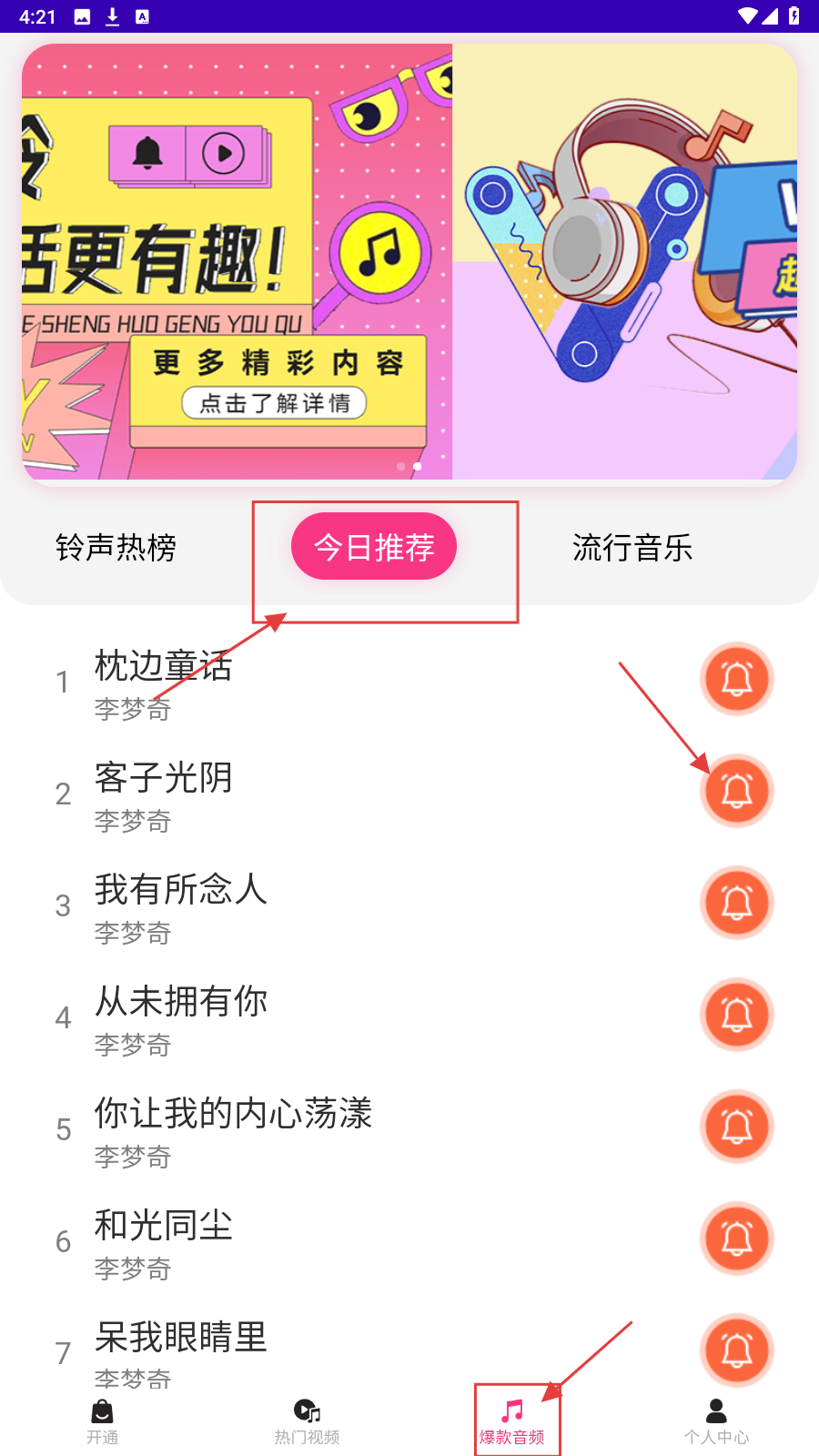 3、点击【今日推荐】,可以查看如李梦奇的《枕边童话》等歌曲,点击歌曲右侧铃声图标可设置铃声。