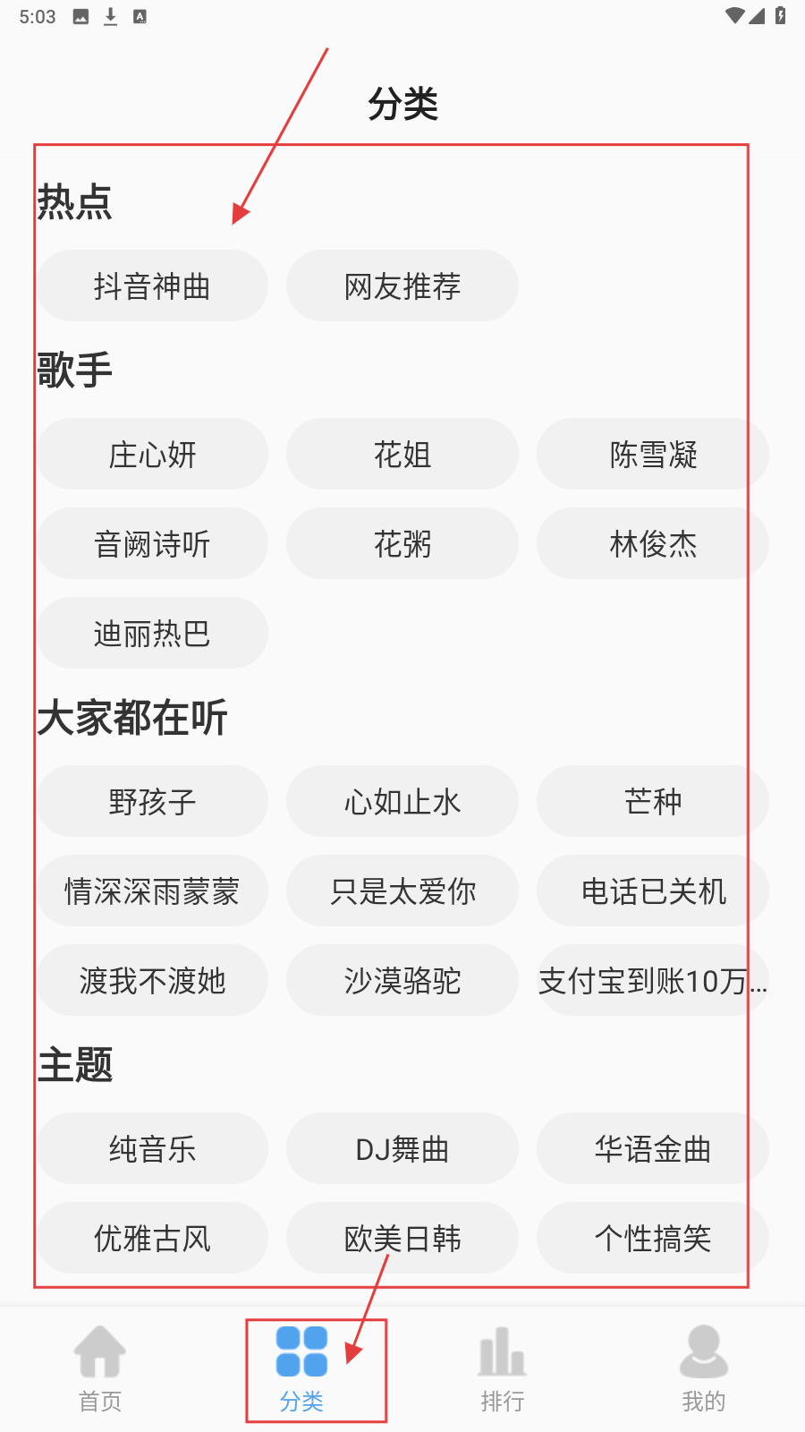 1、打开APP,点击底部【分类】,进入分类页面,这里有【热点】【歌手】【大家都在听】【主题】等板块,可选择喜欢的歌手。