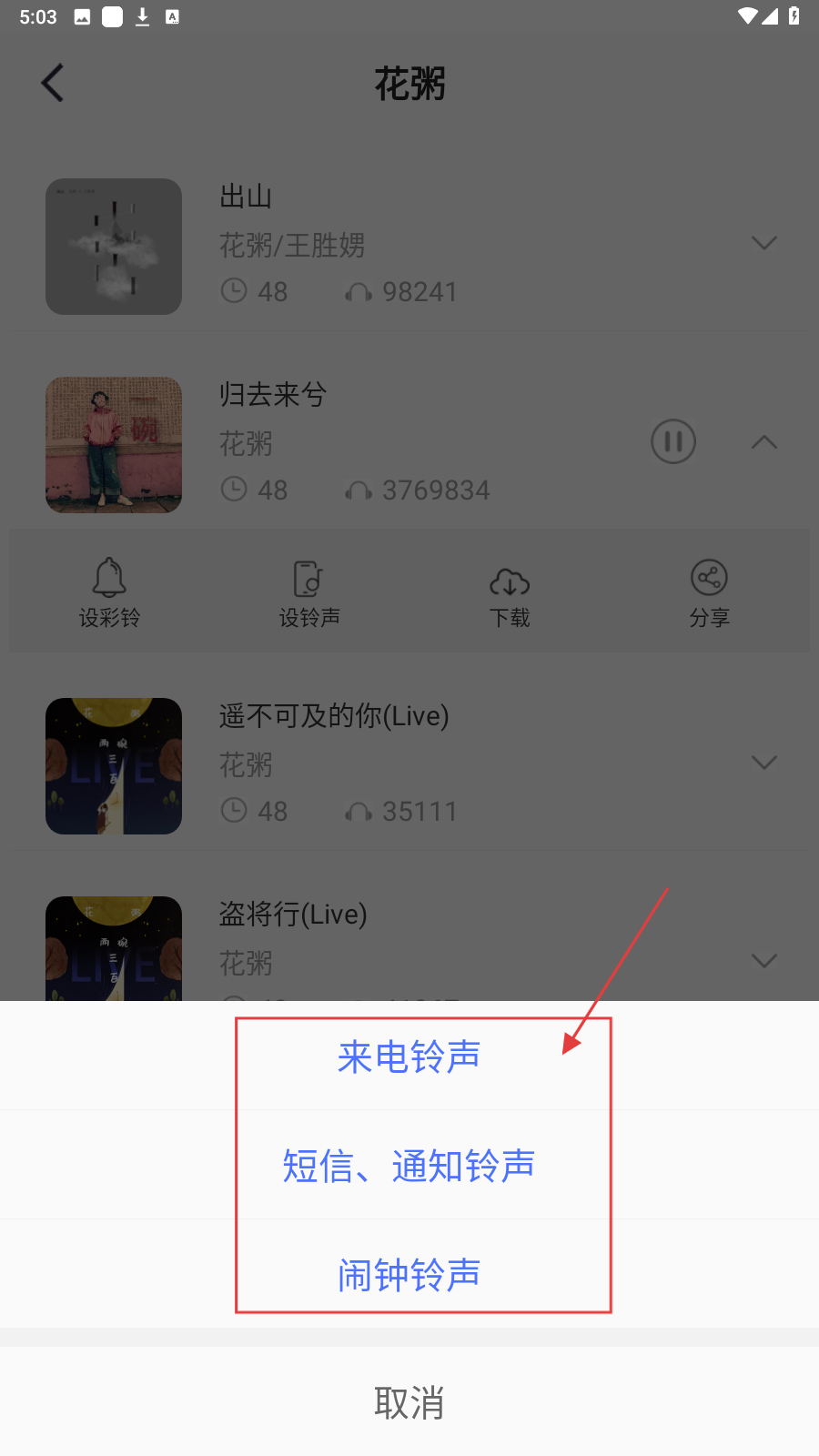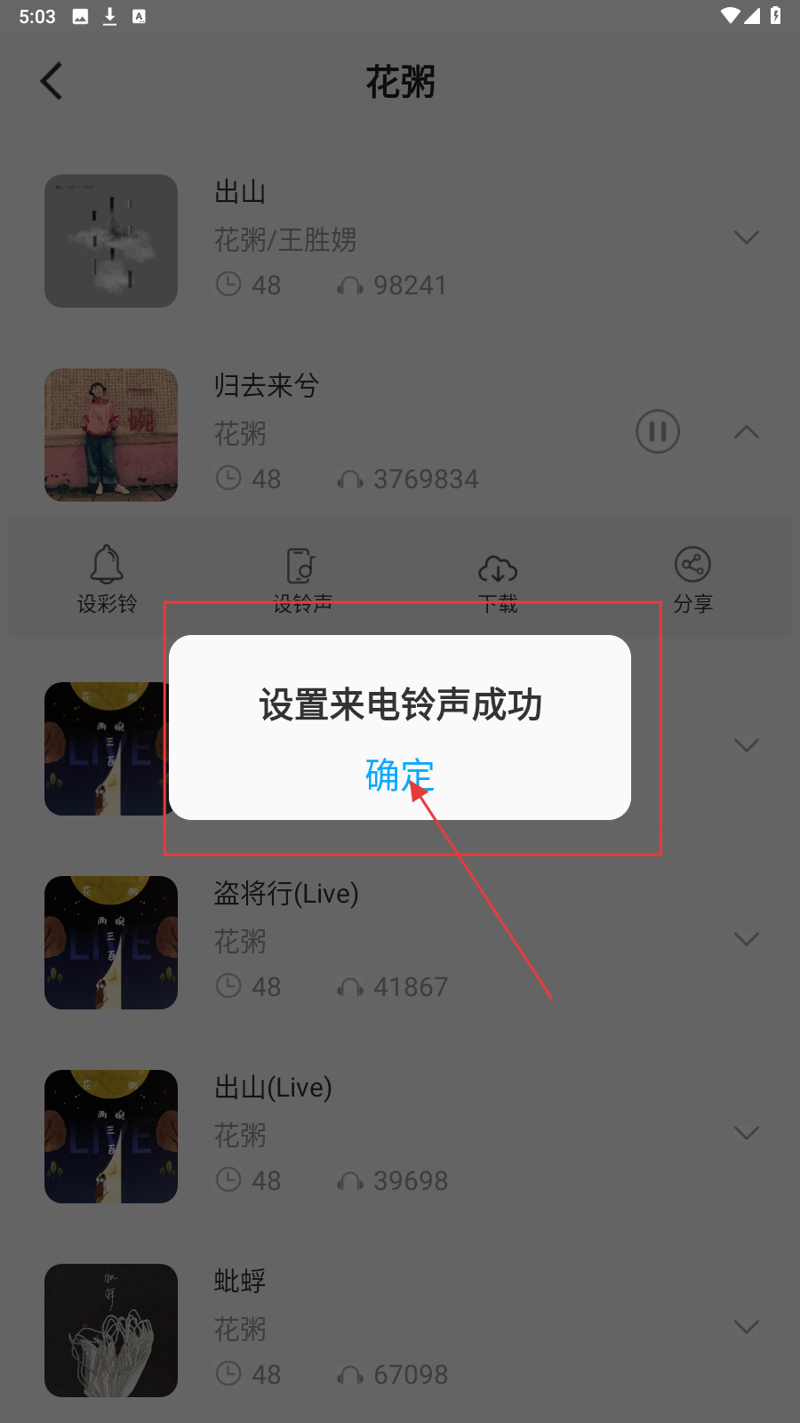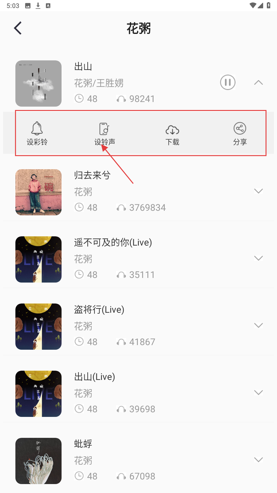 2、以花粥为例,进入花粥的歌曲列表页面,这里有《出山》《归去来兮》等歌曲,点击歌曲下方的【设铃声】按钮。