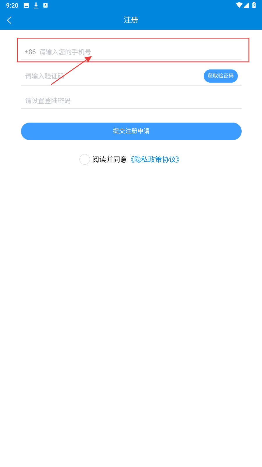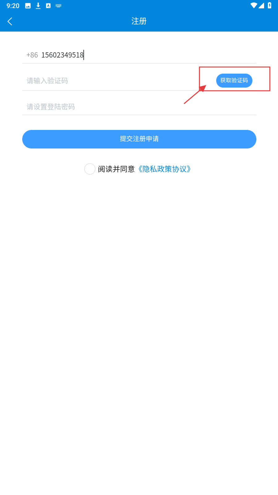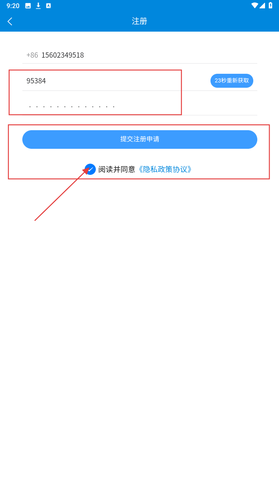 4、收到验证码后,在输入框中输入验证码,设置登录密码,勾选【阅读并同意《隐私政策协议》】,最后点击【提交注册申请】即可完成。