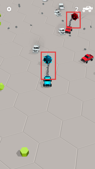 2、操控蓝色车辆,利用连接的刺球撞击并摧毁红色车辆,留意屏幕上方的车辆剩余数量。