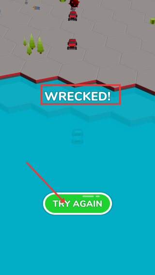 4、若车辆不慎损毁,出现【WRECKED!】提示后,点击【TRYAGAIN】重新开始游戏。