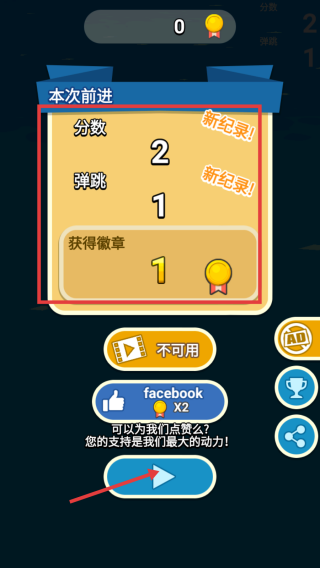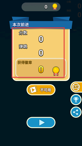 3、游戏结束后,查看【分数】【弹跳】【获得徽章】等数据,了解游戏表现。