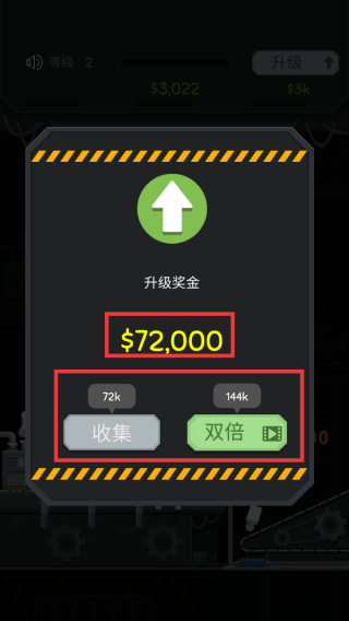 4、升级后出现升级奖金界面,可选择点击【收集】直接领取奖励,或点击【双倍】看广告获取双倍奖励。