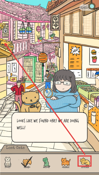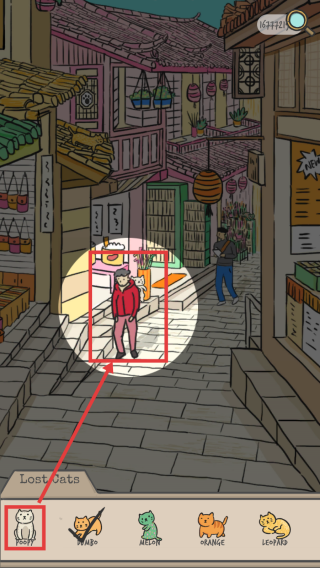 4、利用放大镜道具照亮场景,仔细搜寻像穿着红色衣服人物身旁等可能隐藏猫咪的角落,找到目标猫咪。