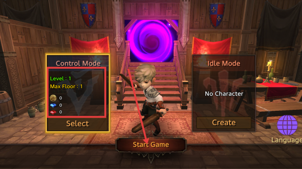 1、在游戏开始界面,选择【ControlMode】(控制模式),点击【StartGame】开启游戏,当前等级为1,最高楼层为1。
