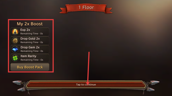 2、进入楼层准备界面,可查看【My2xBoost】选项,如经验、金币、宝石掉落双倍及物品掉率提升等,可按需购买增益包,点击进入游戏。