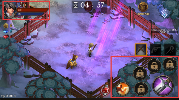 3、游戏中关注左上角角色头像处的等级(Lv1)和生命值、魔法值条,通过右下角技能图标释放技能,部分技能需达到对应等级解锁。