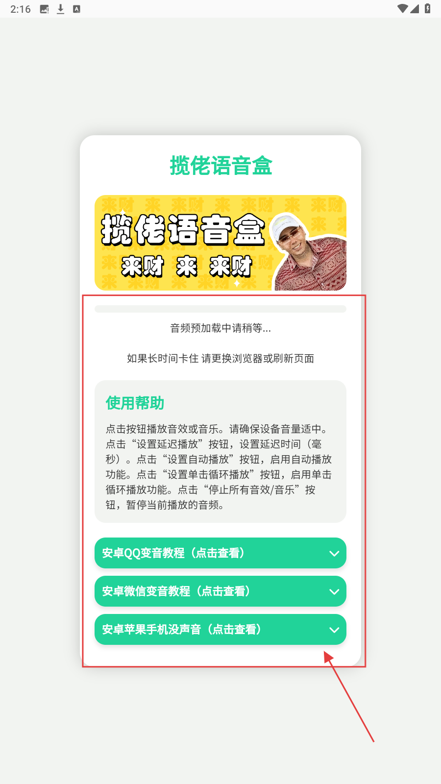 1、打开揽佬语音盒APP,进入加载页面,这里有【使用帮助】板块,可查看安卓QQ变音教程、安卓微信变音教程等使用帮助内容。