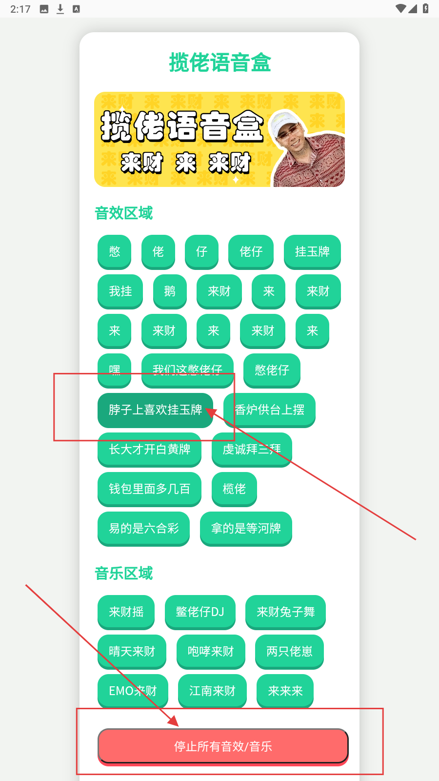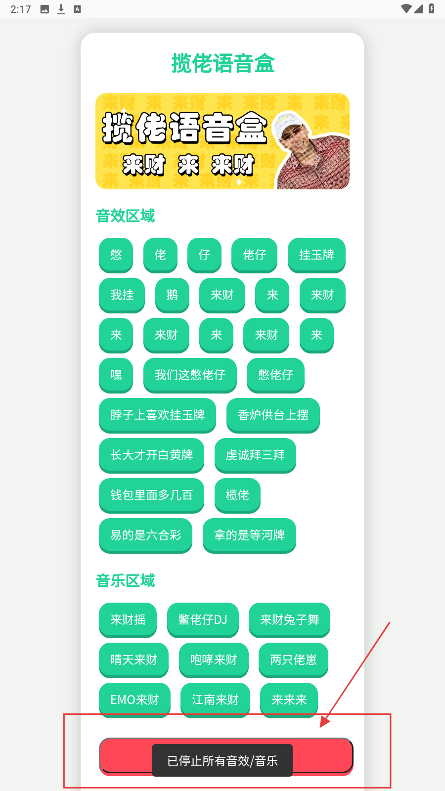 3、可点击按钮播放音效或音乐,如“憋”“佬”等音效,“来财摇”“憋佬仔DJ”等音乐。