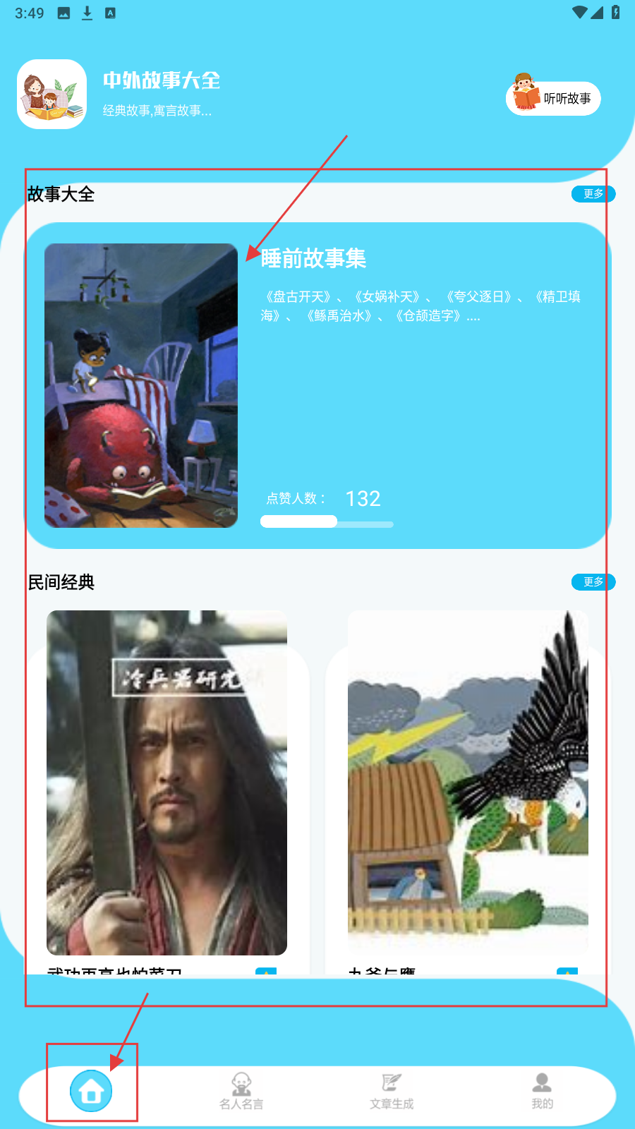 1、打开APP,进入【首页】,这里有【故事大全】【民间经典】等板块,可浏览【睡前故事集】等故事内容,还有【听听故事】功能按钮。