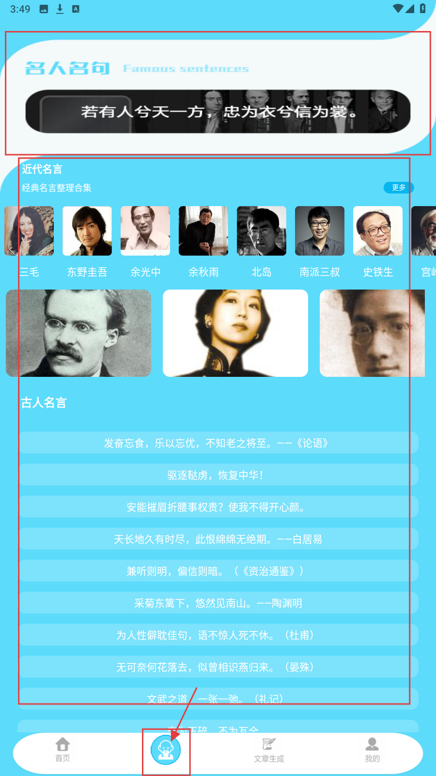 2、点击底部【名人名言】,进入名人名言页面,这里有【近代名言】【古人名言】等板块,可查看三毛、东野圭吾、余光中等名人的名言。