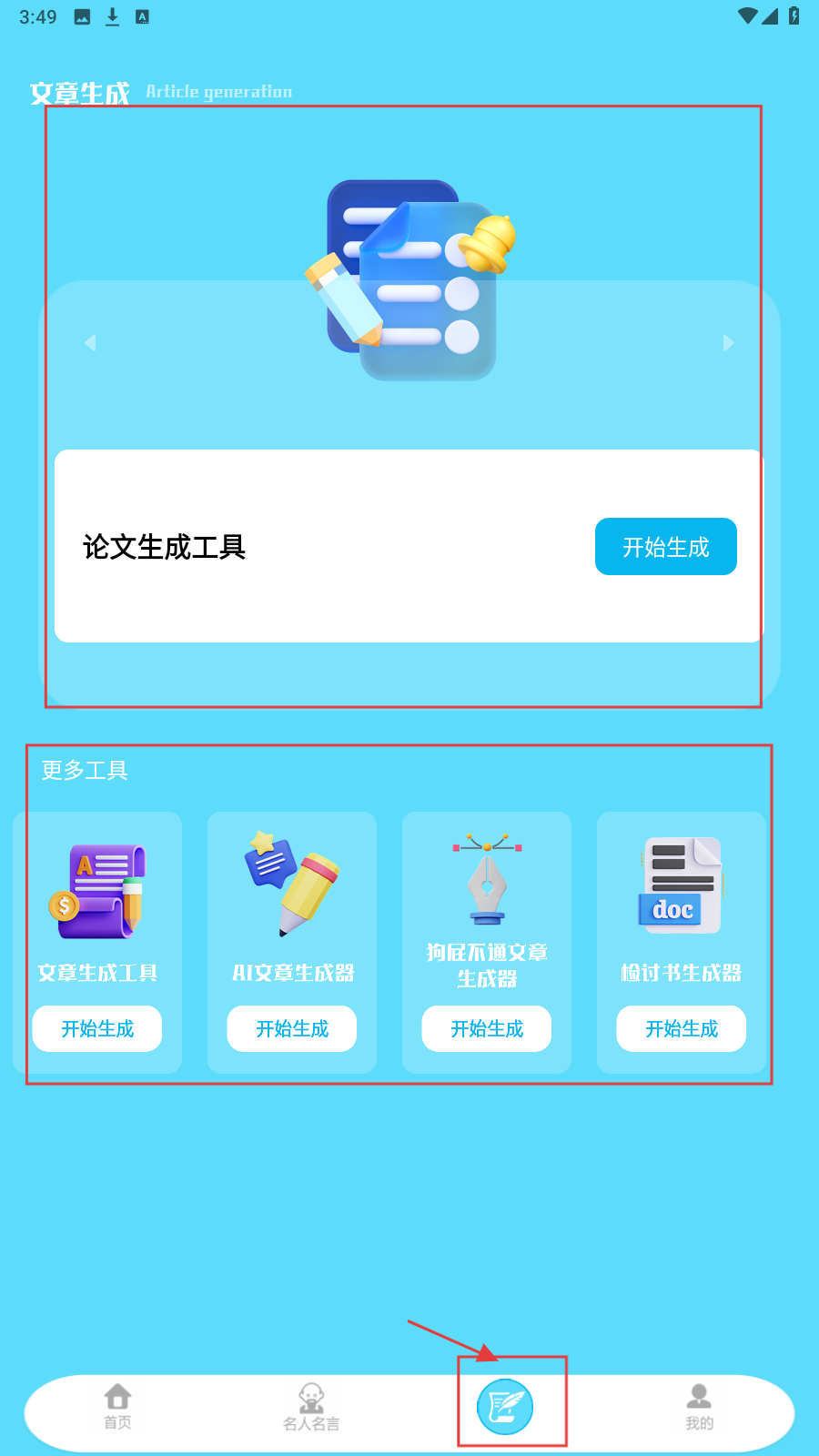 4、点击底部【文章生成】,进入文章生成页面,这里有【论文生成工具】【文章生成工具】【AI文章生成器】等工具,可选择工具生成文章。