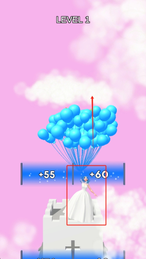 2、收集气球上升:控制女王在关卡中移动,不断触碰气球完成收集,收集到足够气球后,角色会自动带着女王上天。